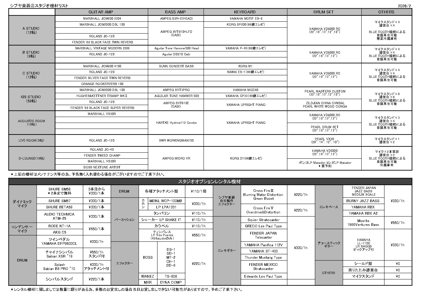 ・アンプ、キーボード、ドラムセットなど位置、セッティングを変えた場合は必ず元の状態に戻してから退出して下さい。