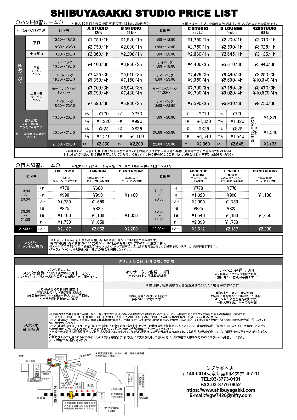 上記は全て会員料金となっております。一般でのご利用の場合バンド練習550円/1h、個人練習220円/1h増しとなります。